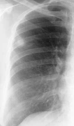 Рис. 4. Аденокарциома. Интенсивная, однородная тень с четкими бугристыми, "лучистыми" контурами и тяжем к плевре.