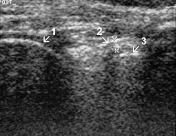 1 — медиальный мыщелок, 2 (+) — задняя крестовидная связка, 3 — большеберцовая