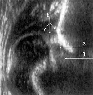 2 - сдавленная, смещенная каудально хрящевая крыша,