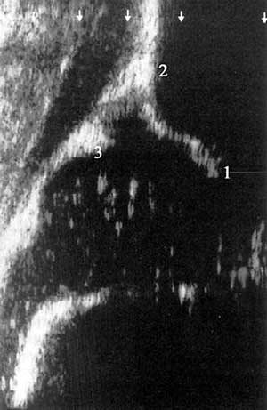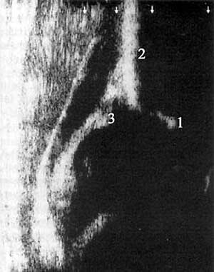 в целом сонограмма, хотя ость (2) и суставная губа (3) имеют правильный вид.