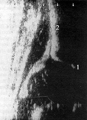 кости (1) представлен не как четкое, ясно ограниченное эхо, а «смазан». Непригодная