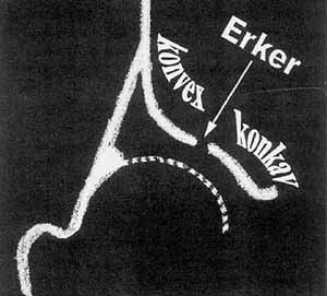 (Слева) Схема правильных поисков костного выступа (эркера).