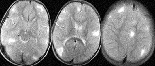 Рис. 2. МР-томограммы головного мозга, Т2-взвешенные изображения. Выявляются множественные очаги гиперинтенсивные в Т2W.