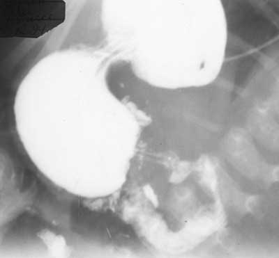 Рис. 3. Больной Г., 1,5 мес. Врожденный пилоростеноз. Симптом «параллельных линий». Распределение контраста по тонкой кишке мелкими порциями.