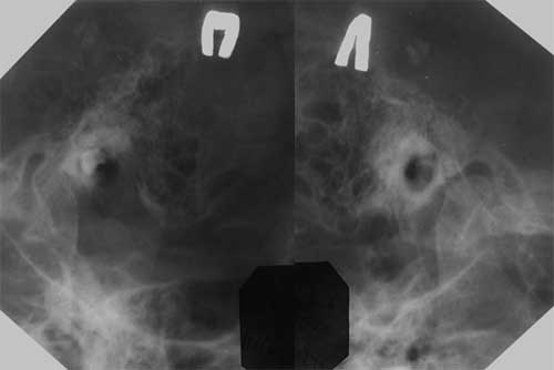 Рис. 2. Опухоль яремного гломуса. На рентгенограмме в проекции Шюллера разрушено дно барабанной полости справа.