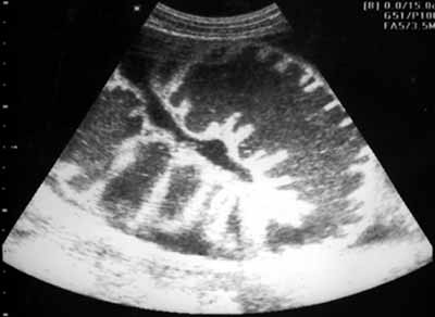 Рис. 1. Эхограмма больного с механической тонкокишечной непроходимостью - спаечный процесс на уровне проксимальных отделов подвздошной кишки. При продольном сканировании на уровне тощей кишки отмечается внутрипросветное депонирование жидкости, расширение просвета тонкой кишки, утолщение складок.