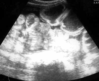 Рис. 3. Эхограмма того же больного. Расширенные петли тонкой кишки сдавливают спавшиеся петли подвздошной кишки, расположенные дистальнее места обструкции.