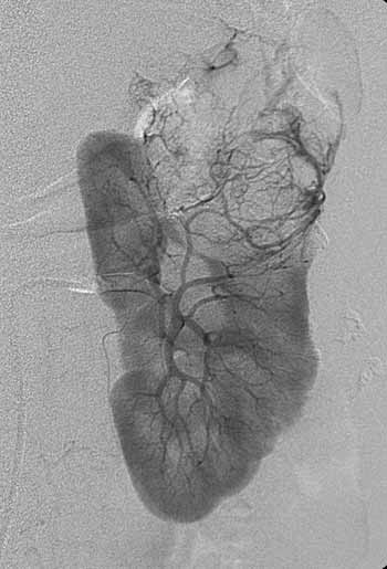 Рис. 1. Рак левой почки. T3a N0 M0. Cеть разнокалиберных опухолевых сосудов, напоминающих языки пламени. Опухоль выходит за пределы контура почки. Внутренняя структура опухоли неоднородная.