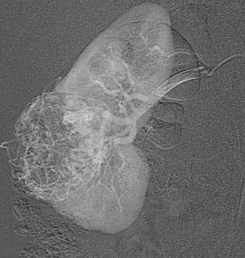 Рис. 2. Рак правой почки. Т1 N0 M0. Гиперваскулярная опухоль округлой формы с чётким контуром в форме «пылающего» шара. Выступает за пределы контура почки менее чем на 1 см.