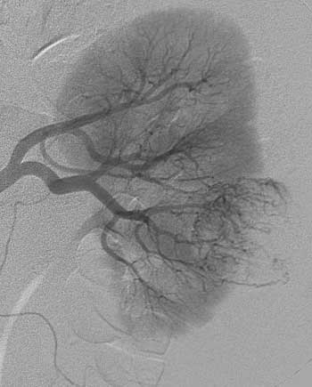 Рис. 4. Рак левой почки. T3aN0M0. Опухоль IV типа васкуляризации. Мелкие опухолевые сосуды неравномерно распре-делены по площади опухоли.