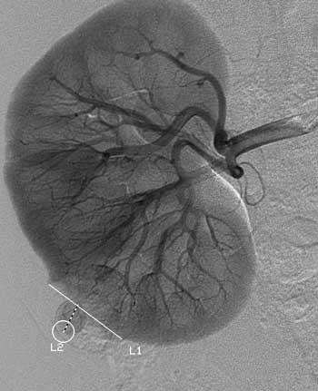 Рис. 7. Рак правой почки. Т1N0M0. Внутри округлого аваскулярного образования (дистанция L1) определяется гиперваскулярный узел (дистанция L2). VII тип васкуляризации.