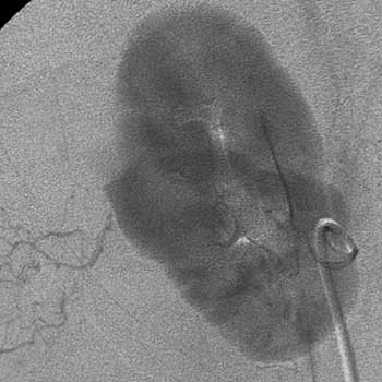 Рис. 9. Рак правой почки. Т1N0M0. В паренхиматозную фазу ангиографии определяется аваскулярное объёмное образование, нарушающее целостность контура почки.