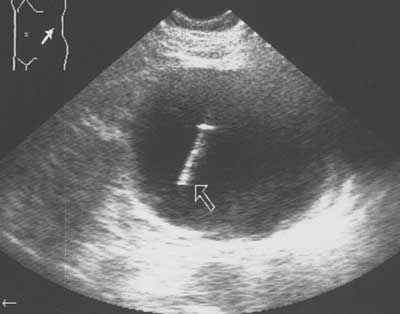 Рис. 2. Эхограмма области левой почки. В просвете кисты определяется тень пункционной иглы (указана стрелкой).