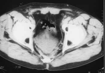 Рис. 2. Через 2 года после операции отмечается деформация и смещение кзади мочевого пузыря, фиброзные изменения предсакральной клетчатки. Рецидива нет.